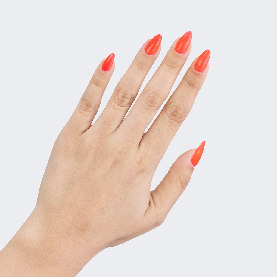 The soft brightness of this neon coral polish doesn’t waste a minute.